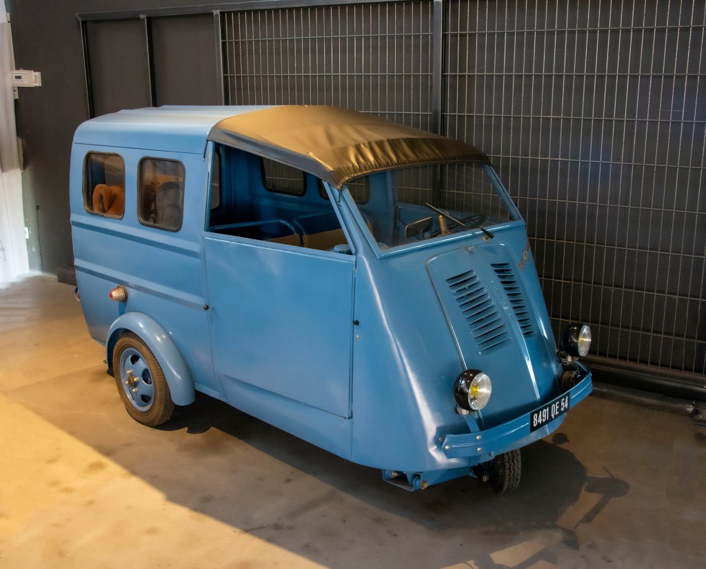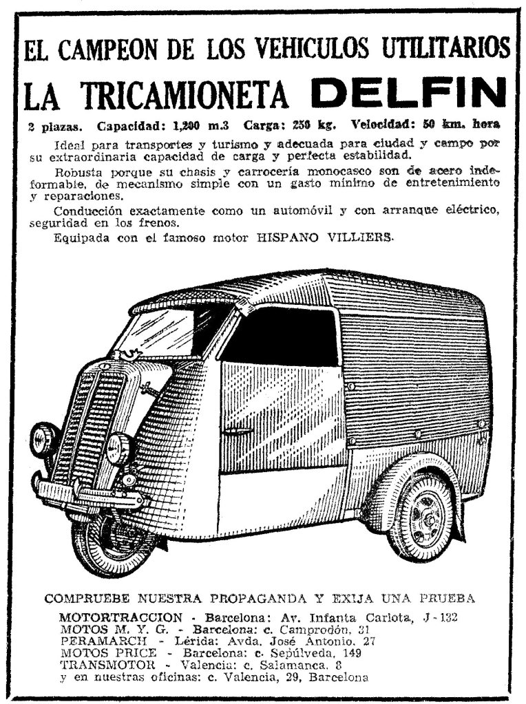 The Delfín tricamioneta (1956–1959) was a steel, three-wheeled transport motocarro. Weighing 250 kg and fitted with a 197 cc Hispano Villiers engine, it topped out at 60 km/h. All units were finished in metallic blue paint and production is estimated at around 20 examples.