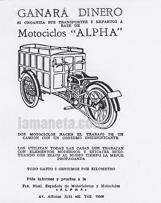 Alpha was a brand of Spanish motorcycle and motocarro, established in Barcelona by Nil Massó on Carrer Sagués, from 1924 to 1957. His motorcycle manufacturing company started producing machines powered by 175cc and 250cc two-stroke engines, sourced from Villiers and DKW.