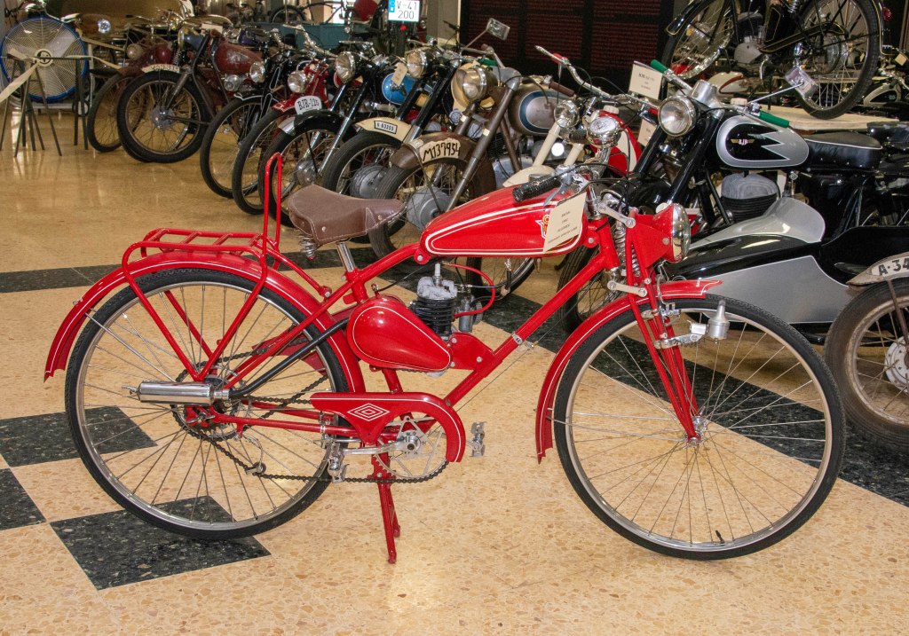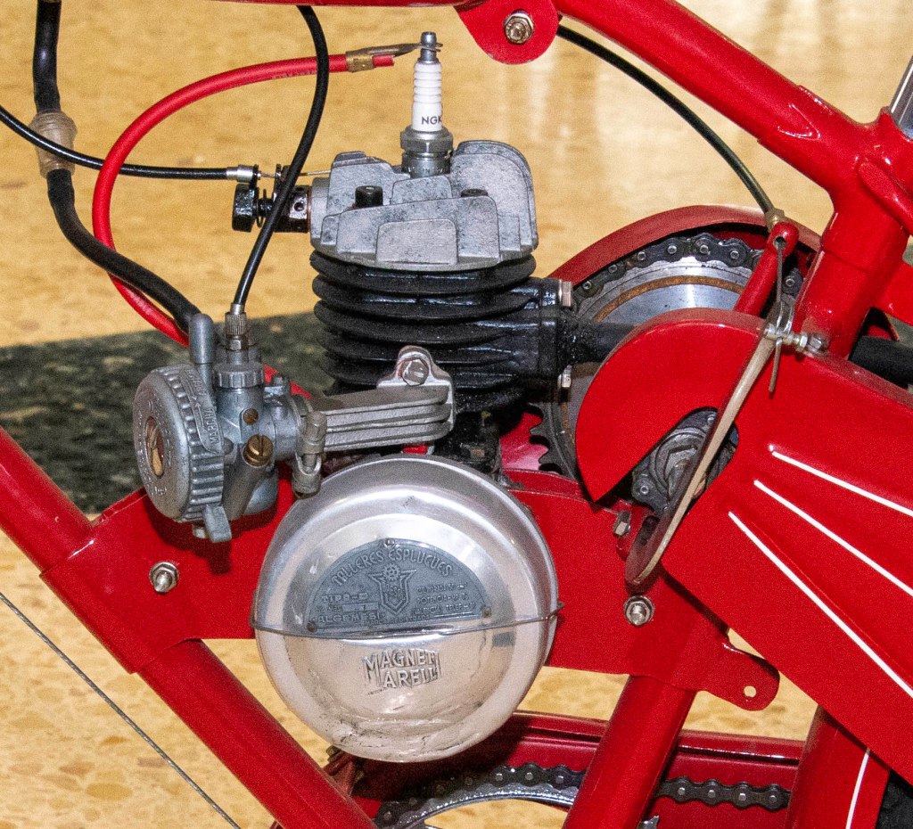 In 1942/43, they began manufacturing and selling two stroke auxiliary engines that could be mounted inside the frame of a bicycle. This engine had magneto ignition, a single gear, and chain transmission to the rear wheel.