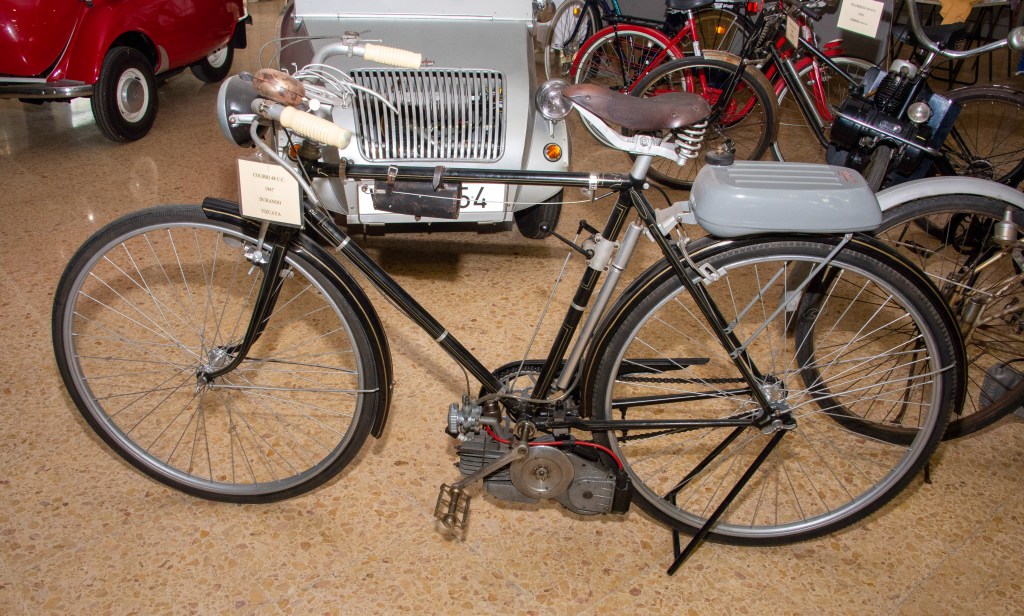 This is a Colibri 48cc auxiliary engine, mounted on a BH brand bicycle that was on display as part of the Sala Santy Collection.