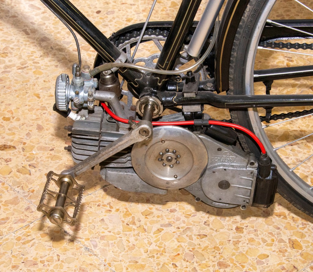 The initial engines were 48cc, two‑stroke, clip‑on style engines that mounted under the bicycle bottom bracket and used a knurled, contact roller transmission system. In 1950 the engines were modified as the Colibri 45, which incorporated a clutchless 2 speed system that allowed steeper gradients to be climbed (14%) without resorting to pedal assistance.