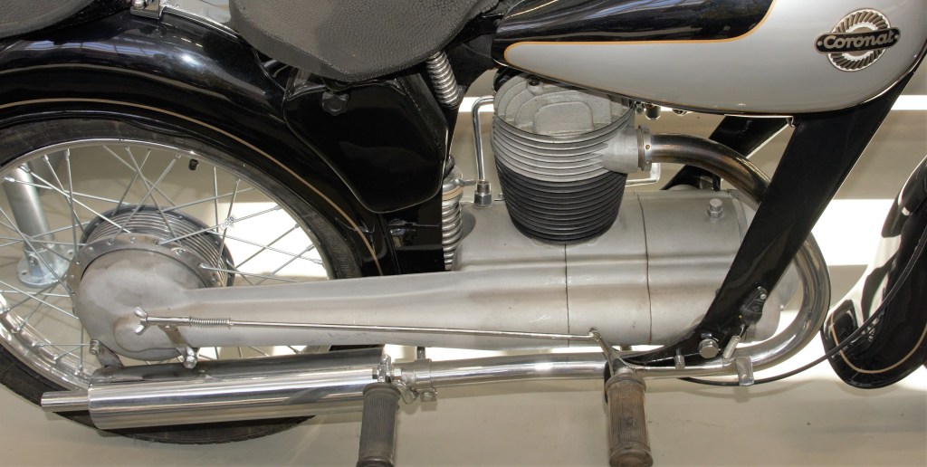 I had first become aware about the existence of this bike a few years ago in a magazine article by the celebrated author and motorcycle photographer, the late Phil Aynsley. He had seen an example of the bike over ten years before in the workshops of the Museo Moto Bassella (Catalonia). It was a fascinating machine, but Phil had very little information about it and when I later visited the Museo Moto Bassella, it did not feature in their display. So, you can imagine my delight to find one on display in August 2022, at the “Made in Spain” museum in Alcalá de Henares (Madrid). Information about the very short-lived brand is still very scarce but the Coronat is a 200cc (62 mm x 66 mm) air-cooled, four-stroke, single cylinder and it has a four-speed gearbox, with a drive shaft. The output is stated as 10 HP at 4,500 rpm with a top speed of 100 kph and a consumption return of 2.5 litres per 100 kilometres.