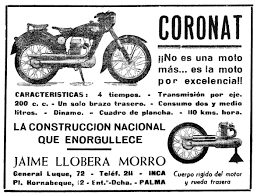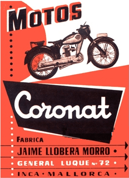 The Coronat is a very rare motorcycle from Inca on the Spanish island of Mallorca, where it had been developed and built by Jaime Llobera Morro in 1955, at his factory, Fabrica Jaime Llobera Morro, located at Carrer General Luque 72, Inca.