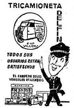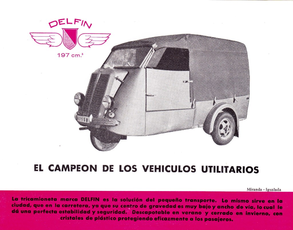 The Delfín tricamioneta (1956–1959) was a steel, three-wheeled transport motocarro. Weighing 250 kg and fitted with a 197 cc Hispano Villiers engine, it topped out at 60 km/h. All units were finished in metallic blue paint and production is estimated at around 20 examples.