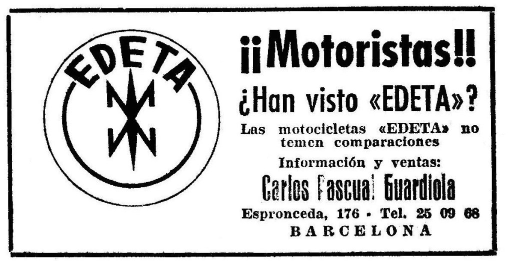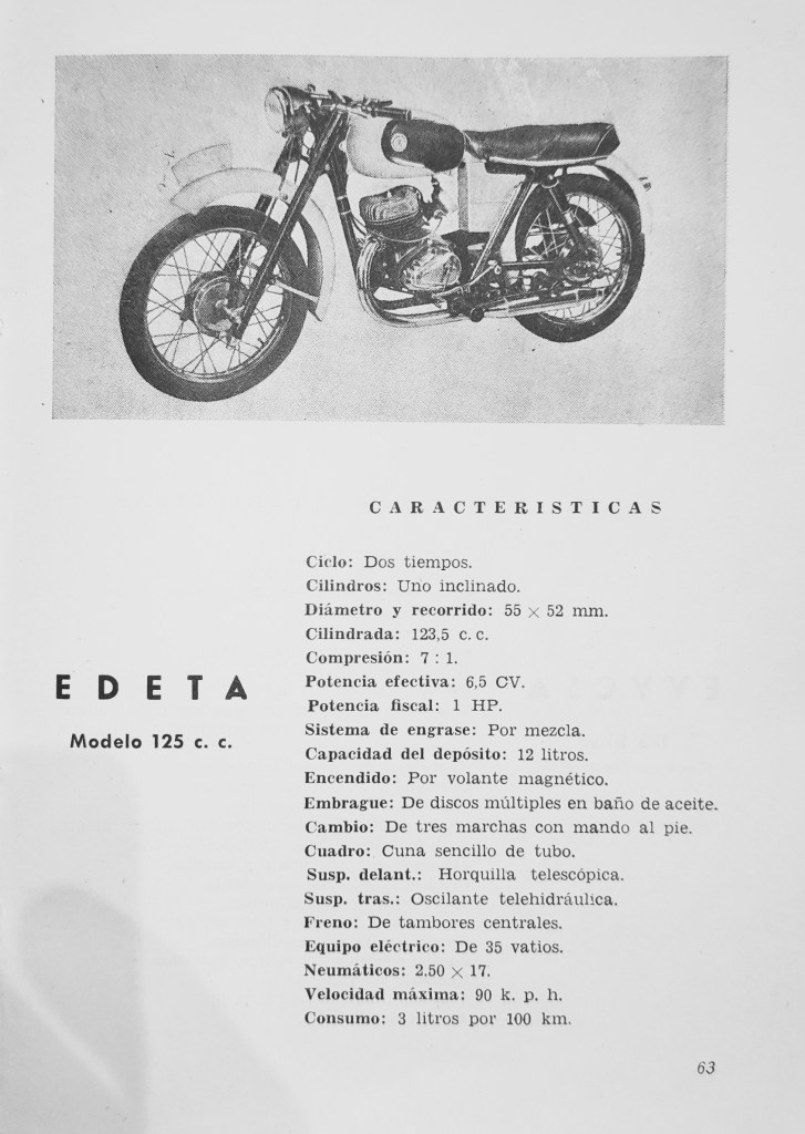 This Edeta 125cc Data Sheet (pre-Hispano Villiers engine) is reproduced from the Catalogo Español de Motocicletas 1957 Finanzauto SA