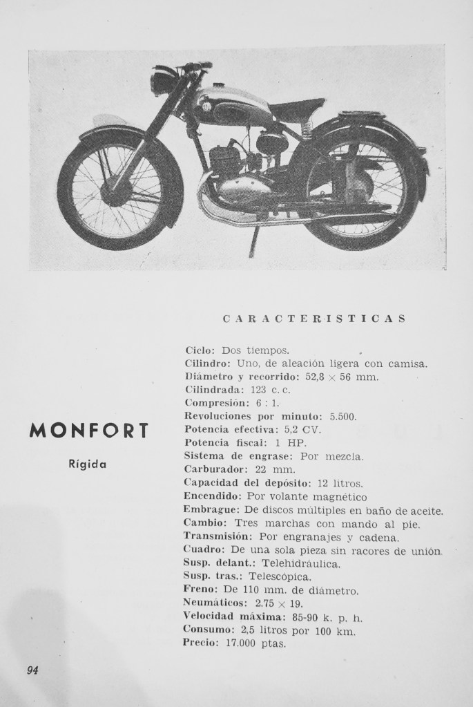 Manufacturas Mecániques Monfort, SL – with a facility at Francesc Macià Avenue. 97, Esparraguera, Catalonia. They had produced some parts for Aleu motorcycles and absorbed the firm when it went bankrupt in 1956. Monfort employed around 40 workers and, initially, produced the Aleu motorcycles under the Monfort name before going on to produce their own motorcycles for a few years. They also built an Enduro under the Alfer brand name for which they built the frames.