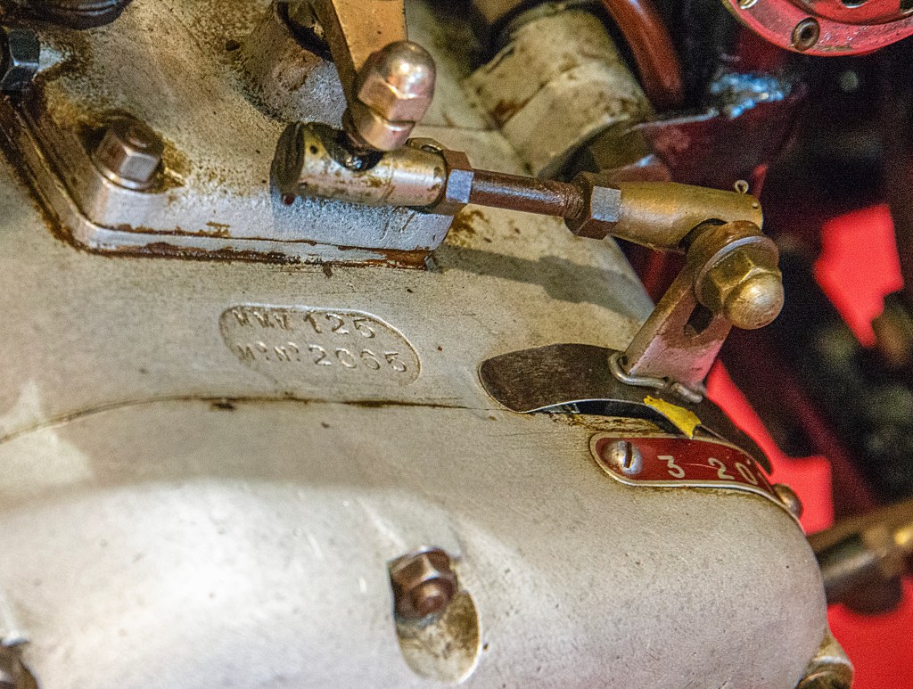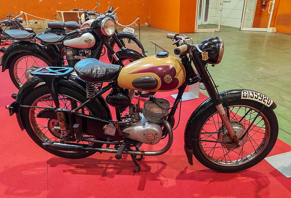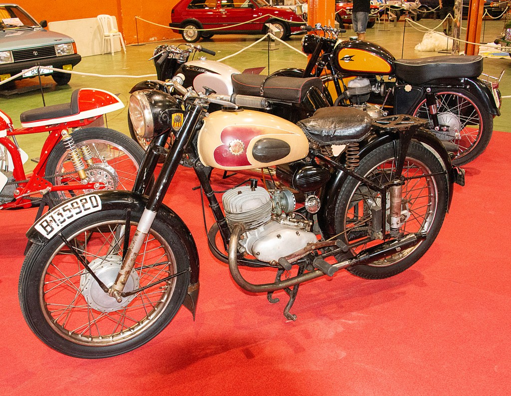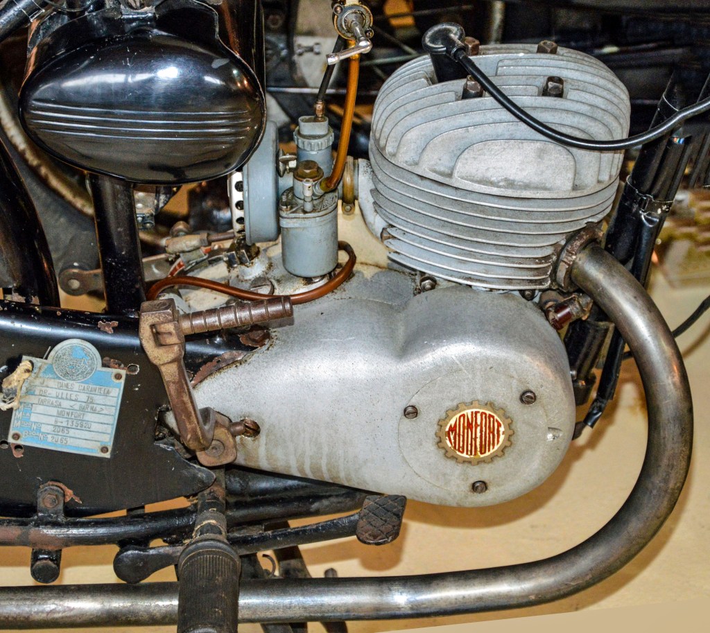 The Monfort motorcycle was a 125cc, air cooled, single cylinder, two stroke producing 5.2 HP, that was marketed in 2 variants – the “Basculante” and the “Rigidia”. Both models featured a three speed gearbox and delivered very similar performance with the main difference being rear suspension. The “Rigidia” had a single, sprung saddle and teloscopic rear suspension whereas the “Basculante” had a double one piece saddle and oscillating rear suspension.