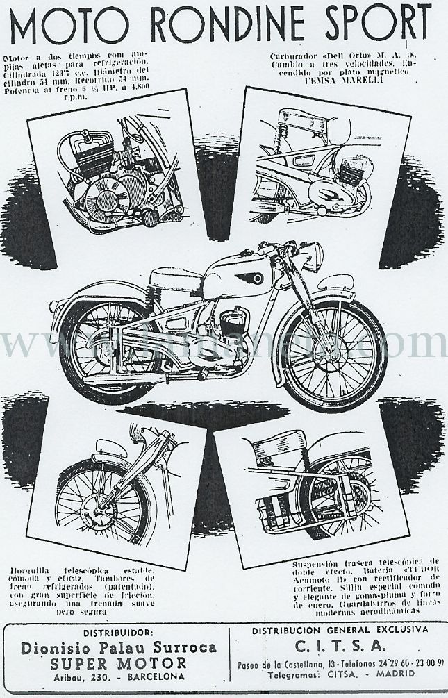 The Rondine 125cc Sport is one of the lesser-known classic Spanish motorcycles. The superiority of the Sport was maintained by using many parts made within their own Madrid factory under strict quality control. In the early 1950s, the Lube brand was the quality machine produced in Spain (in Bilbao) and the Rondine 125cc Sport compared vary favourably with it. Surprisingly, the Rondine was marketed at a price higher than the Lube by a margin of circa fifteen to twenty percent.