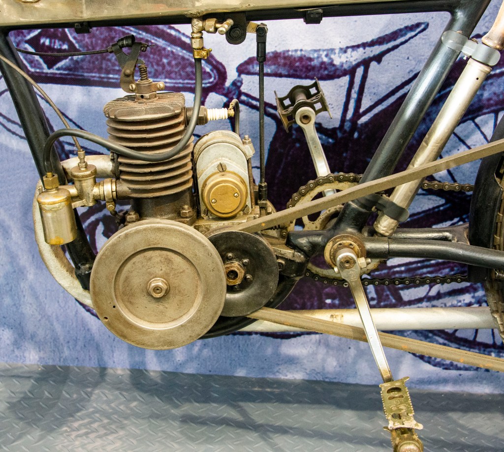 Reference sources estimate the production output of the Salvador motorcycles to be around 200 units, comprising a mixture of engines that included French built units from the company of Emile Train, Swiss built Moser units and MAG units from the Swiss manufacturer Motosacoche.  Engine types included both two and four strokes with capacities ranging from 125cc to 350cc.   The photographed motorcycle dates from 1924 and features in-house components including the 125cc, two stroke, monobloc engine and carburettor, all mounted in an in-house built cradle frame with Salvador forks.