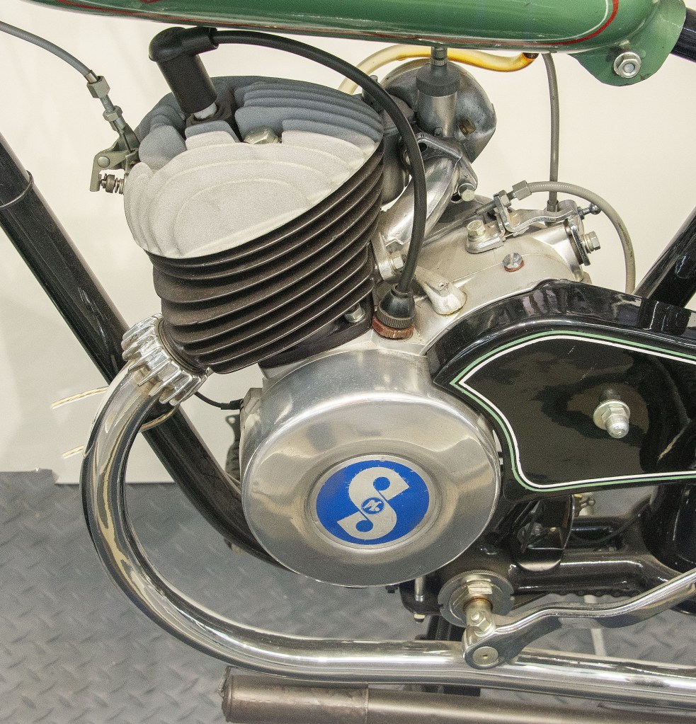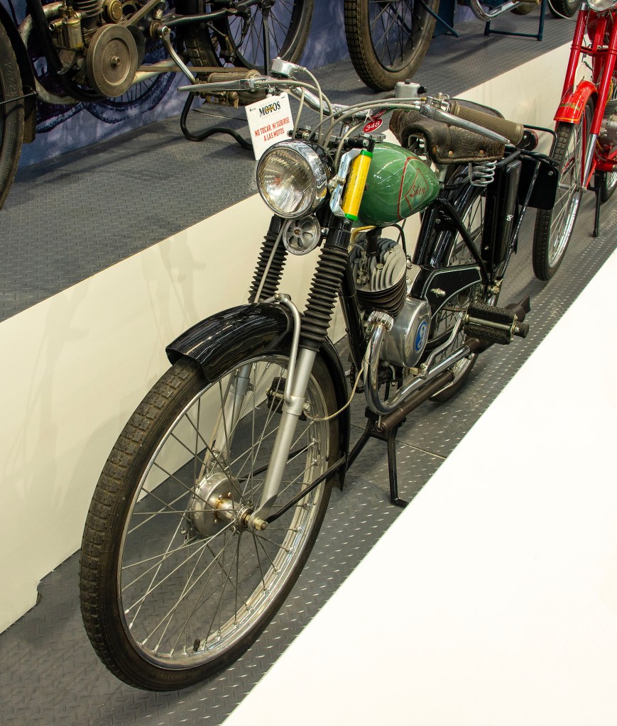 For bespoke builds, the most important component to acquire is an engine. In this case, the engine used is a German marque, the Sachs M32, 98cc (48mm x 54mm), air cooled, two stroke, single with a 2-speed gearbox. These engines were launched in 1932 and, according to the museum, this unit dates from 1936, although the bike is believed to have been finished in 1957. These engines had a long production run, and, by 1945, there had been over 750,000 units built and they were used by manufacturers in Germany, France, Belgium, Scandinavia, Eastern Europe, and South America.