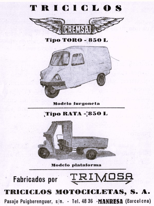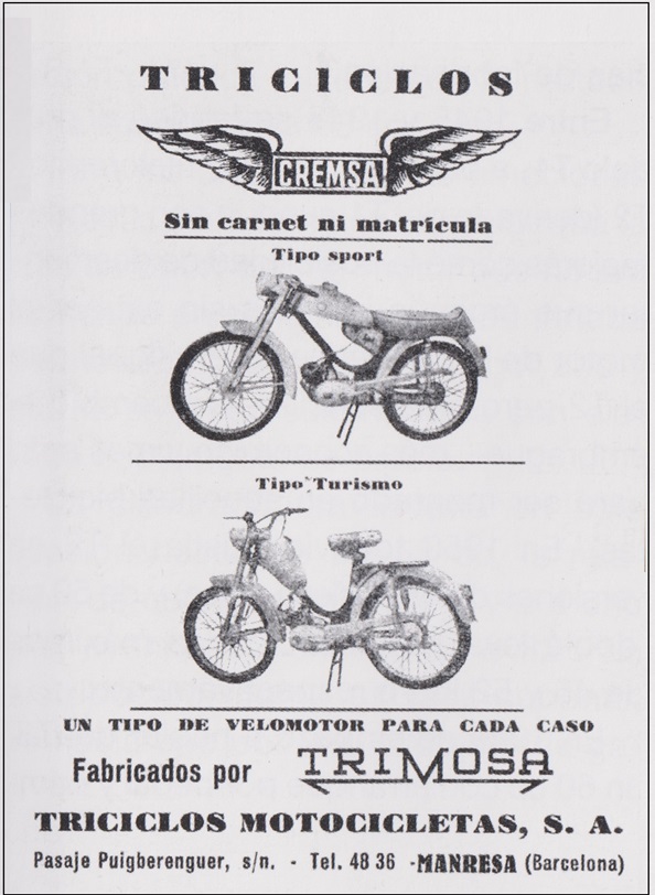 The crisis in the transport sector took its toll on Cremsa and, in 1963, its assets were absorbed by Trimosa (Triciclos Motocicletas S.A). Trimosa were also from Manresa where they were based on Pasaje Puigdeberenguer.